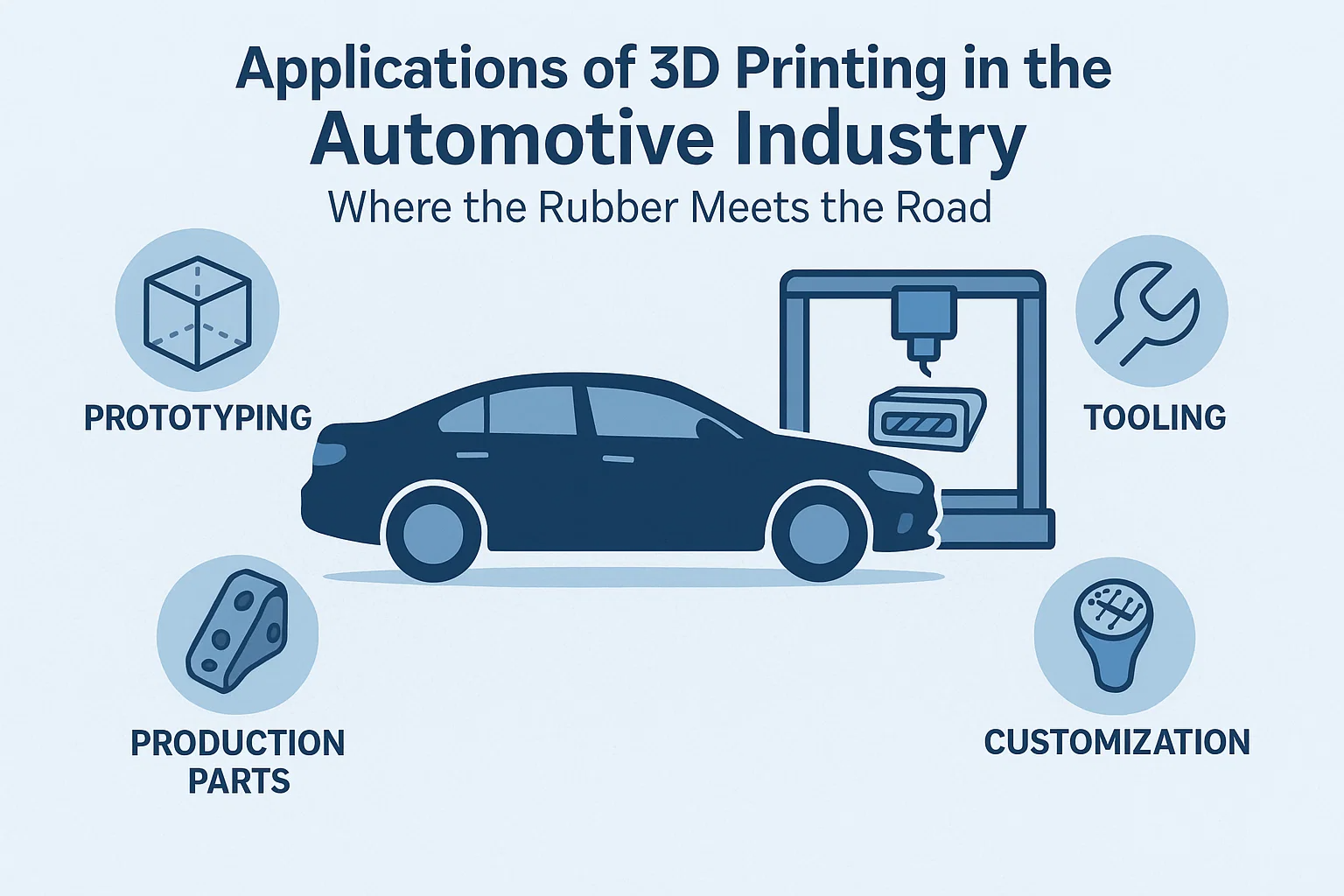 Clúdaíonn an téarma "priontáil 3D" teaghlach teicneolaíochtaí, agus úsáideann an tionscal feithicleach roinnt príomhpháirtithe, ag brath ar cé acu an bhfuil fréamhshamhail phlaisteach thapa nó comhpháirt miotail struchtúrtha de dhíth orthu:
