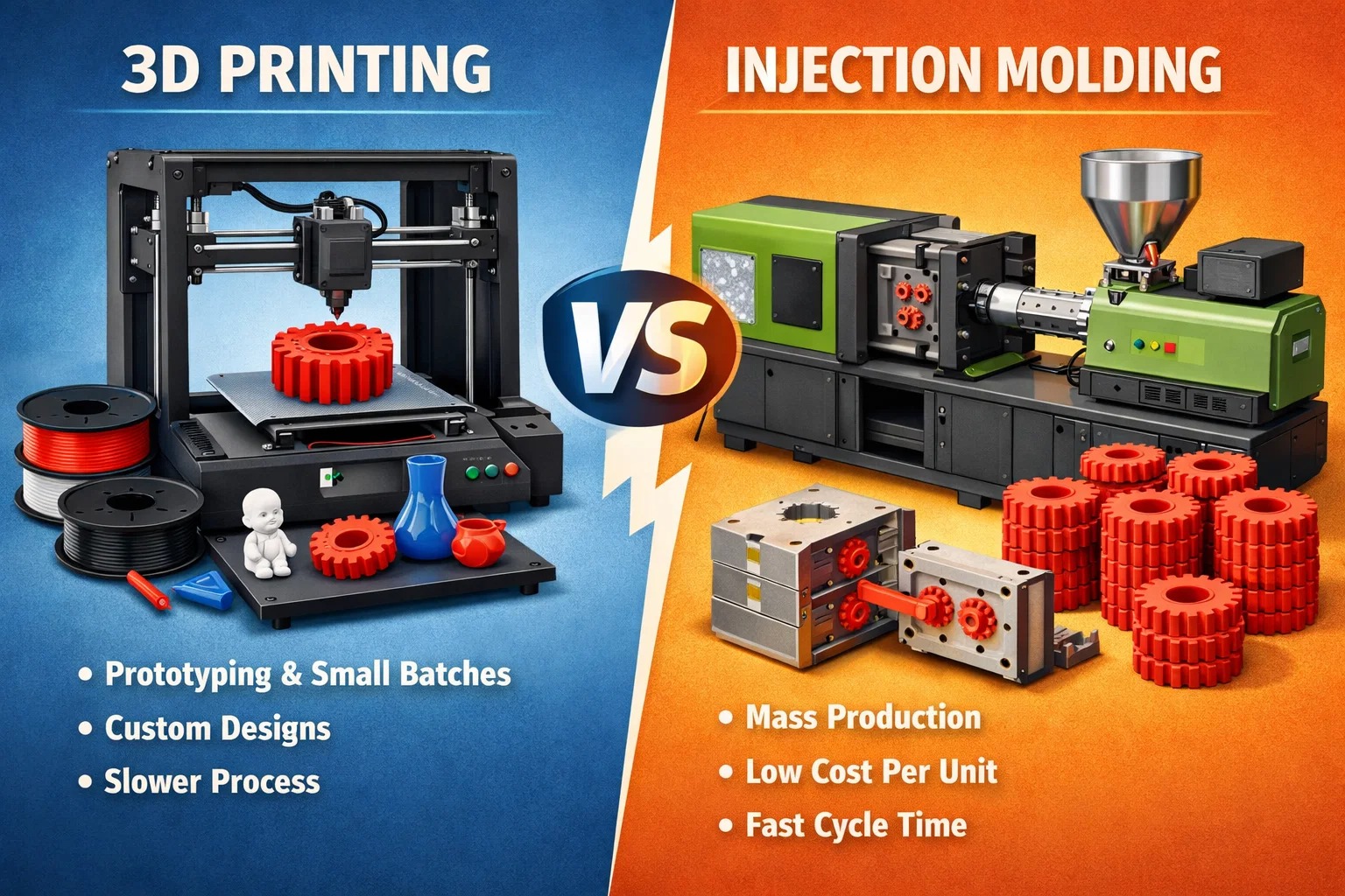 Ceapann formhór na ndaoine gur rogha shimplí é idir an “scoil nua” (Priontáil 3D) agus an “seanscoil” (Múnlú Instealladh). Ach go hionraic? Is annamh a bhíonn dubh agus bán ann.