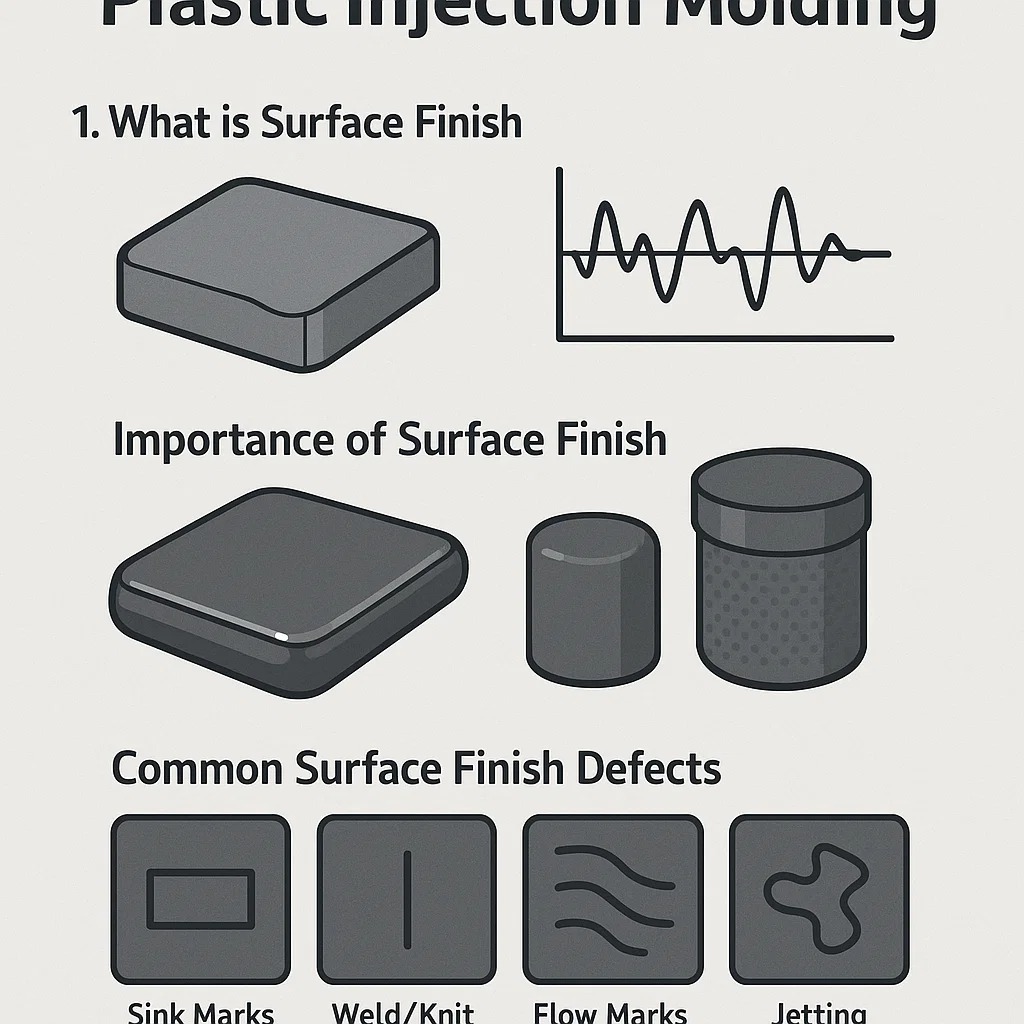 - Caighdeán Tionscail: Tá an plastics industry often uses the SPI (Cumann an Tionscail Plaistigh) Aicmiú Críochnaigh Dromchla , a théann ó Scáthán (gráid A) go Neamhlonrach/Dull (gráid D). Is gnáthchleachtas é grád SPI a shonrú agus múnla á dhearadh.