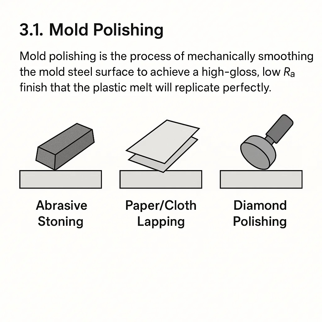 - Snasú Mould: Tá snasta beachta ag baint úsáide as greamaigh diamanta nó clocha scríobacha ag teastáil le haghaidh páirteanna scátháin-chríochnaithe (SPI A-grád).