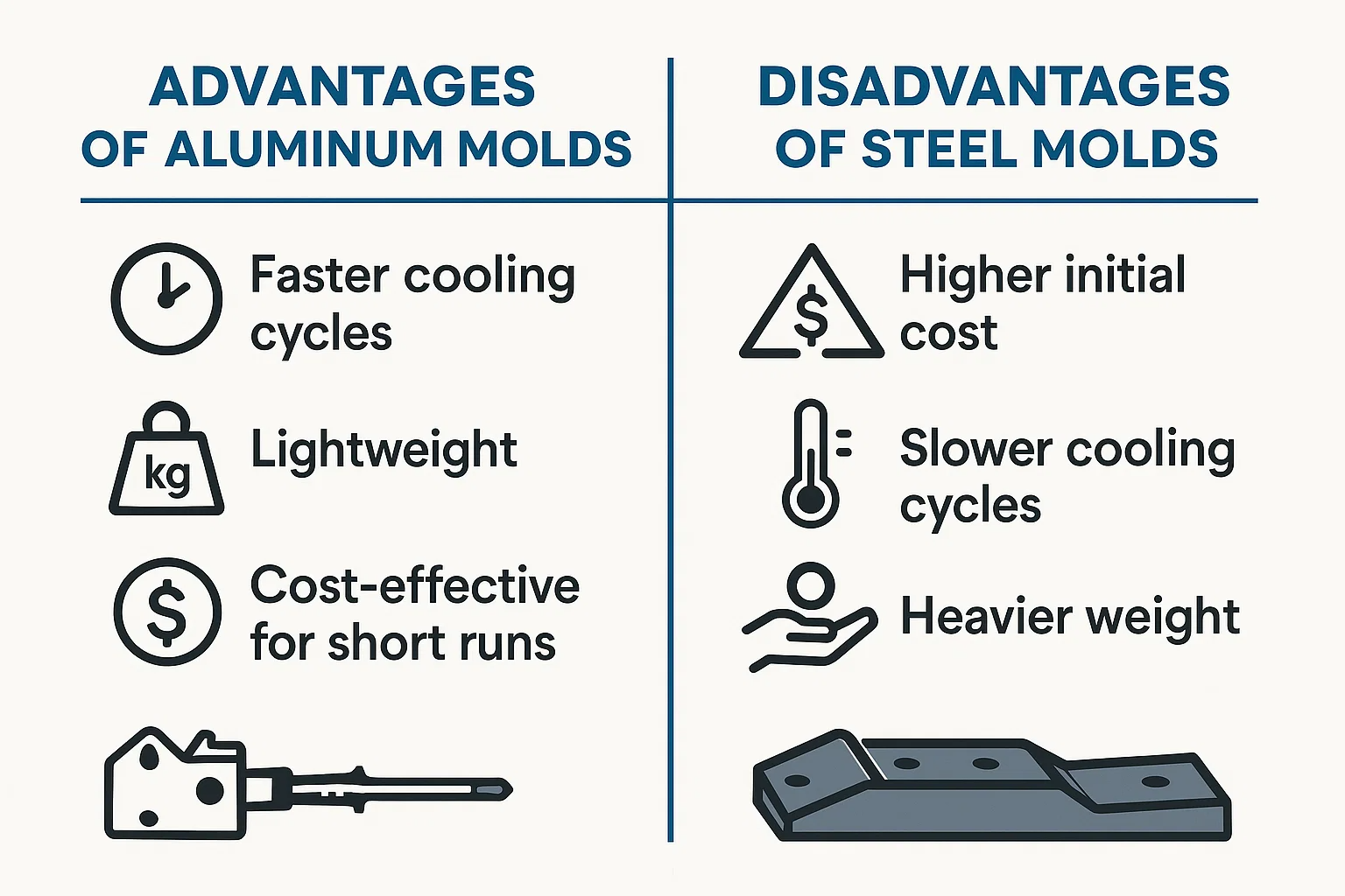 Alúmanam tá sé i bhfad níos éadroime ná cruach - i bhfad trian den mheáchan. Fágann sé seo go bhfuil múnlaí alúmanaim níos éasca agus níos sábháilte le láimhseáil, le hiompar agus le bunú. Cuireann an meáchan laghdaithe níos lú brú ar an meaisín múnlaithe freisin, rud a d'fhéadfadh a bheith in ann cófraí níos lú a úsáid. Múnlaí cruach tá siad trom agus dochreidte, agus is minic a éilíonn siad trealamh speisialaithe chun láimhseáil agus suiteáil.