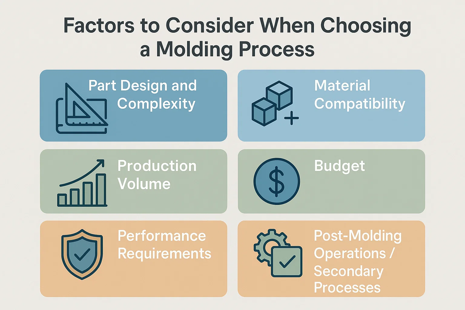 Is cinneadh criticiúil é an próiseas múnlaithe is oiriúnaí a roghnú i measc an mhúnlú isteach, an iomarca, agus an comh-mhúnlú a théann i bhfeidhm ar fheidhmíocht táirgí, ar éifeachtúlacht déantúsaíochta, agus ar chostas foriomlán. Tá meastóireacht chríochnúil ar roinnt príomhfhachtóirí riachtanach sula ndéantar teicníc ar leith.
