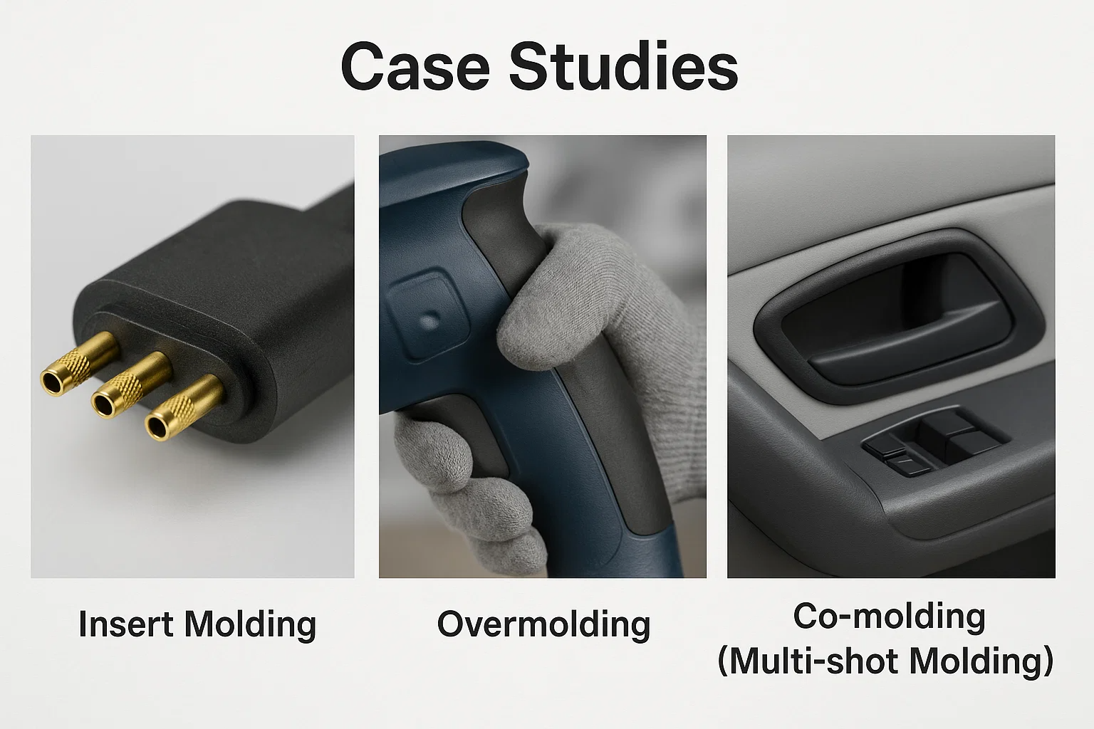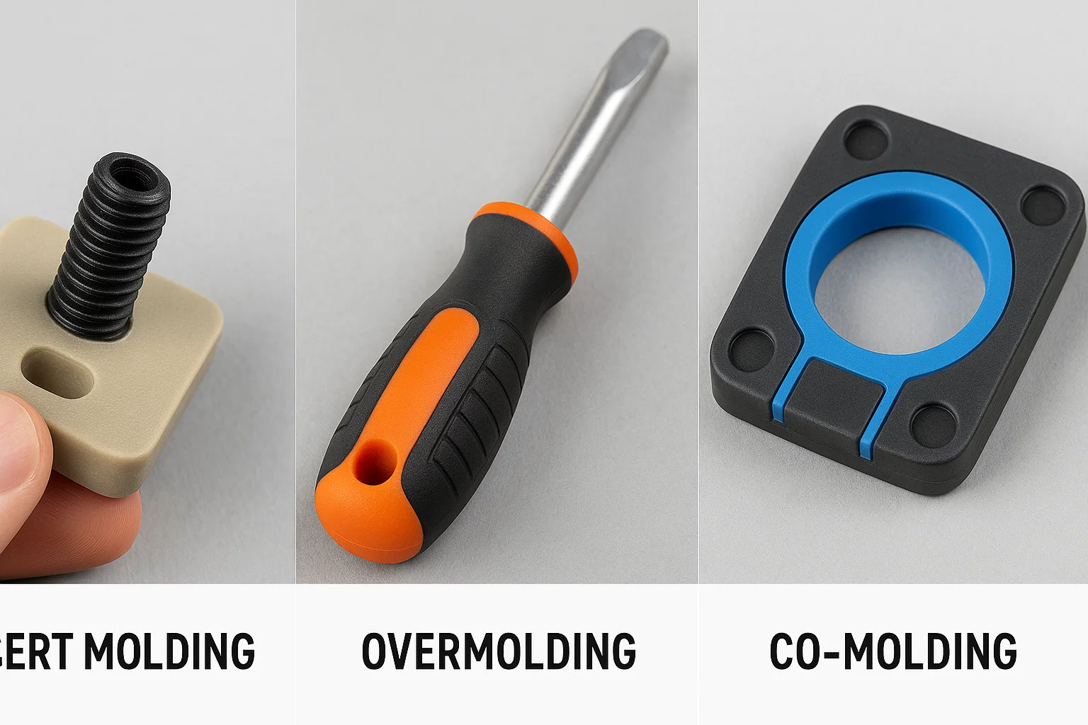 | Ábhair tipiciúla | Cuir isteach: miotail, ceirmeach, gloine, leictreonaic. Múnlaithe: teirmeaplastics (ABS, níolón, ríomhaire, pp). | Foshraith: teirmeaplastics dochta (ABS, PC, níolón, pp). Overmold: TPES, TPUS, plaistigh níos boige. | Teaglaim éagsúla teirmeaplaisteacha-teirmeaplaisteacha comhoiriúnacha nó teirmeaplaisteacha-TPE. |