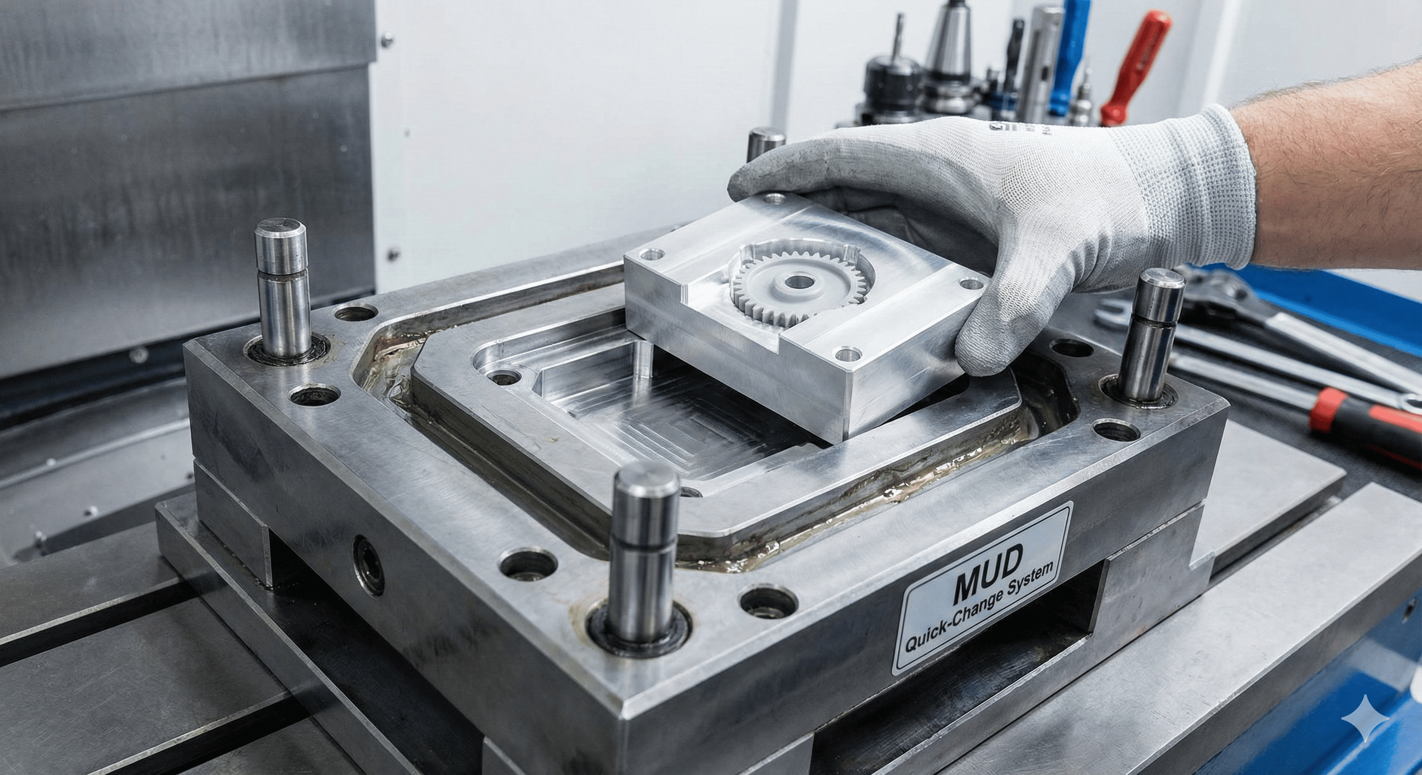 Tarlaíonn an t-ardú trom le linn Dearadh Mhúirín . I dtáirgeadh ard-toirte, bíonn imní ort faoi gach micrea-dara den am timthriall, agus mar sin tógann tú “seaicéid uisce” casta le haghaidh fuaraithe. I múnlú íseal-toirte, déanaimid simpliú. úsáidimid Máistir Aonad Die (MUD) bunanna - frámaí caighdeánaithe a choinníonn iatáin saincheaptha. Ciallaíonn sé seo nach bhfuil againn ach an “cuas” (an cruth páirte) a ghearradh agus ní an bloc ollmhór miotail ar fad.