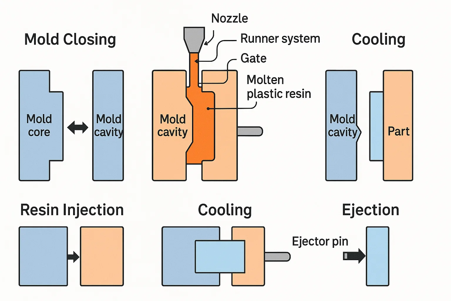 Dúnadh múnla: Tosaíonn an próiseas leis an gcroílár múnla agus leis an gcuas múnla ag gluaiseacht i dtreo a chéile go dtí go mbíonn siad ag clampáil le chéile. Cruthaíonn an gníomh seo an neamhní inmheánach séalaithe - cruth na coda deiridh. Tá cruinneas an ailínithe seo ríthábhachtach, mar is féidir le haon mhí -ailíniú a bheith ina chúis le "Flash" (Ábhar iomarcach ag dul amach ar feadh na líne scaradh).