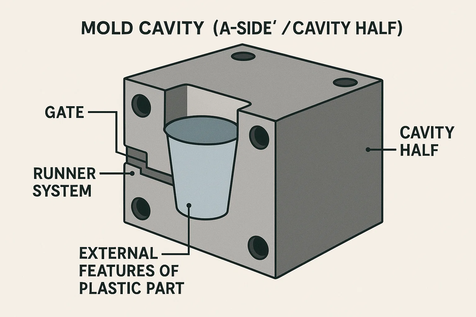 An cuas múnlaithe , ar a dtugtar an "taobh-taobh" nó "leath cuas," is é an chomhpháirt a chruthaíonn an Gnéithe seachtracha den chuid phlaisteach. Is é an bhlaosc seachtrach nó an coimeádán a líonann an plaisteach leáite. Ag baint úsáide as an analaí cupáin phlaisteacha, bheadh an cuas mar an taobh amuigh den chupán, lena n -áirítear a liopa agus a bhallaí seachtracha.