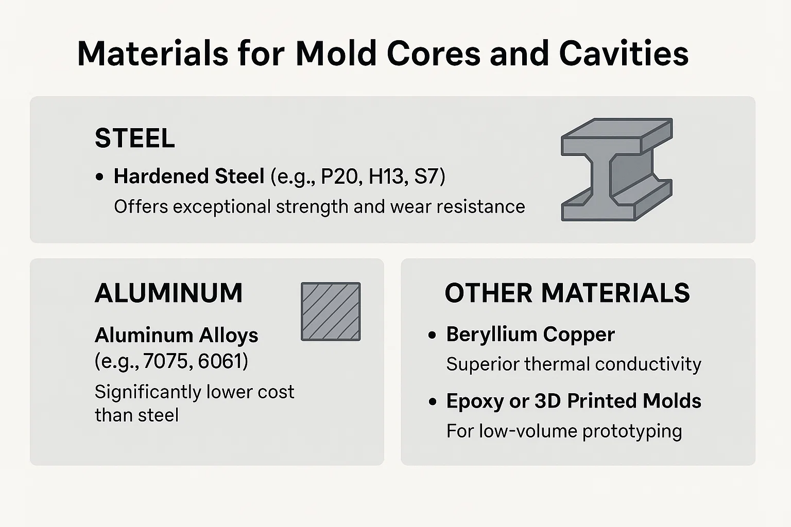 Tá an t-ábhar a roghnaítear don chroílár agus don chuas criticiúil, toisc go dtéann sé i gcion go díreach ar mharthanacht, ar chostas agus ar an gcumas chun codanna ardchaighdeáin a tháirgeadh go héifeachtach. Braitheann an roghnú ar fhachtóirí cosúil leis an gcineál plaisteach atá á múnlú, an méid táirgthe riachtanach, agus castacht an pháirt -dhearadh.