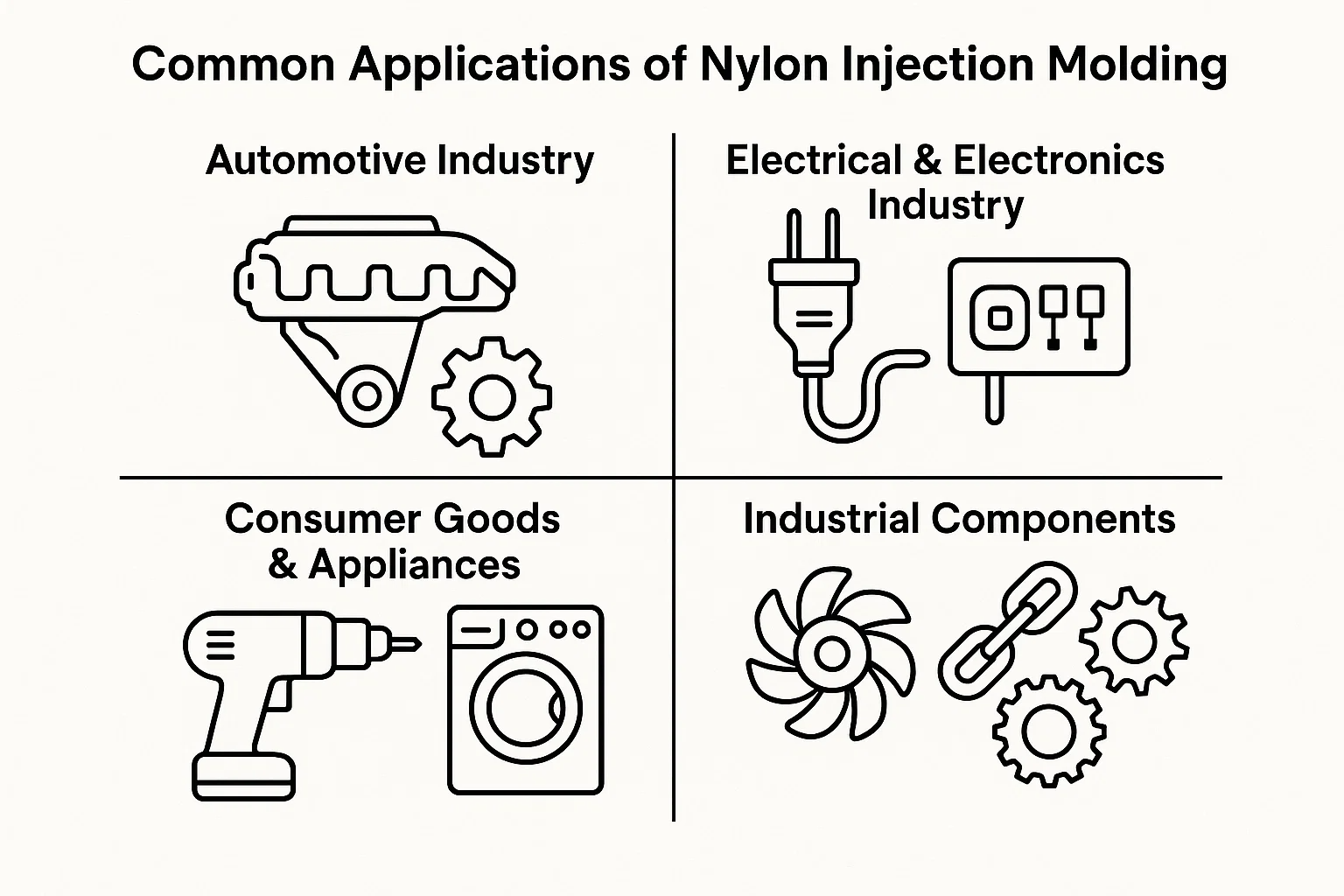 Tá earnáil na ngluaisteán ar cheann de na tomhaltóirí is mó de níolón múnlaithe insteallta, go háirithe gráid threisithe (PA6 agus PA66 líonta gloine), áit a bhfuil feidhmíocht i dtimpeallachtaí ard-teasa riachtanach.
