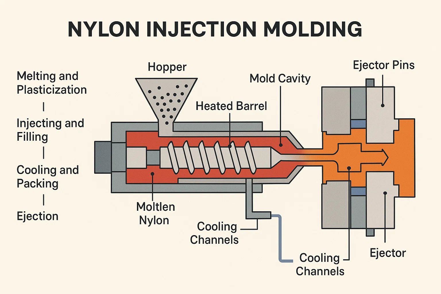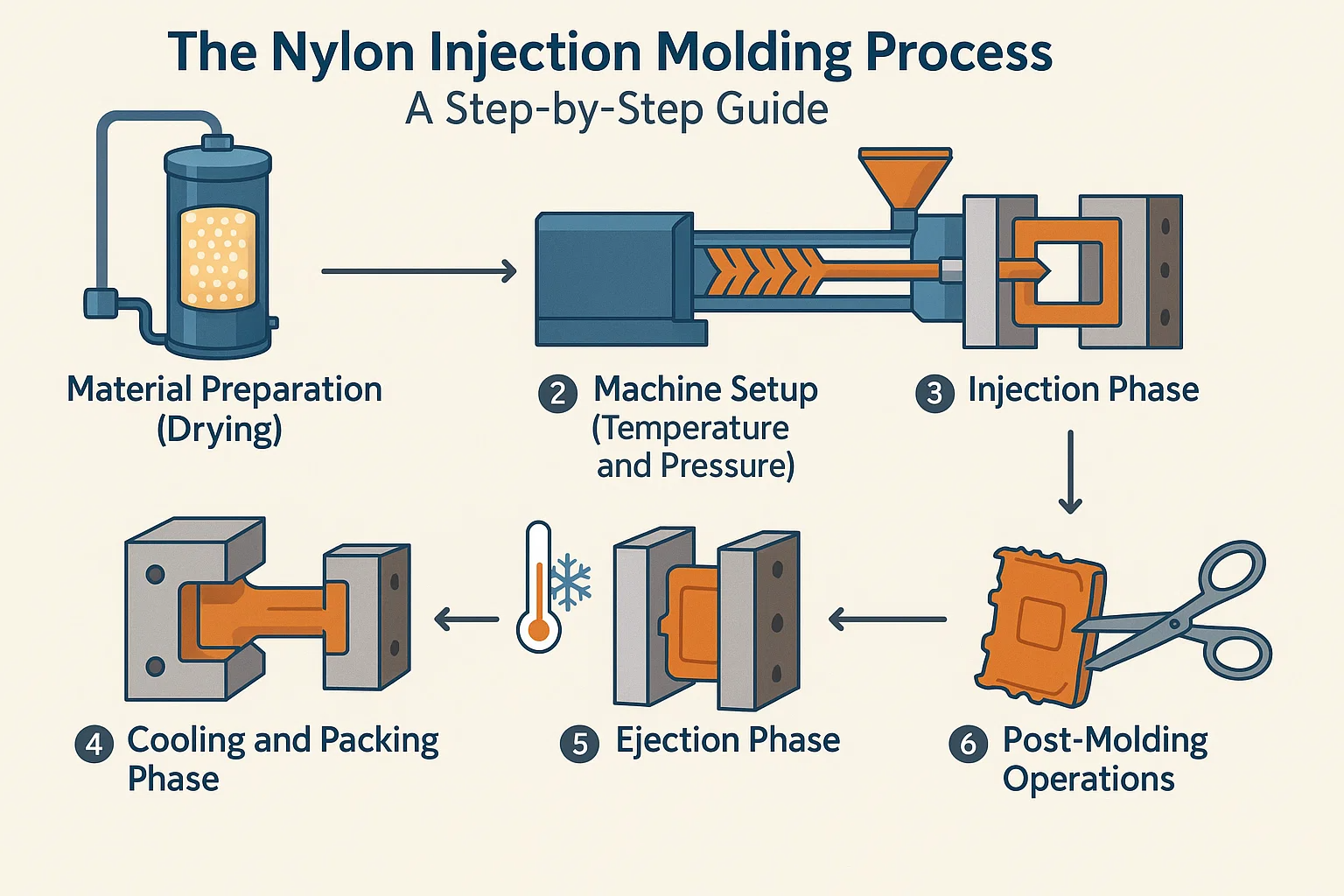 Tá an próiseas cosúil go bunúsach le múnlú insteallta plaistigh eile, ach éilíonn sé aird ar leith ar theocht, rialú taise, agus brú insteallta mar gheall ar shaintréithe uathúla ábhar níolón (go sonrach a leá ard agus nádúr hygroscópach).