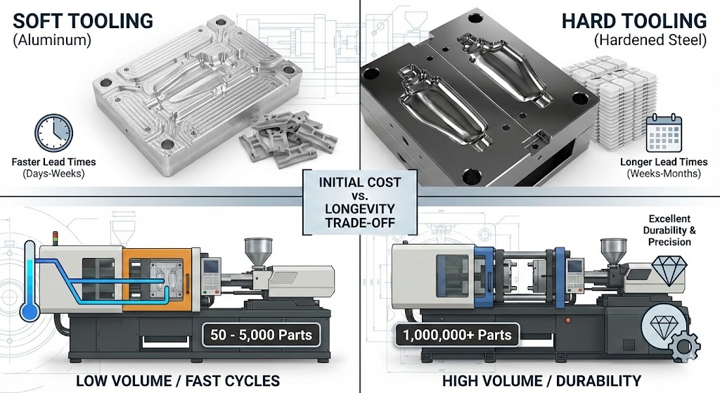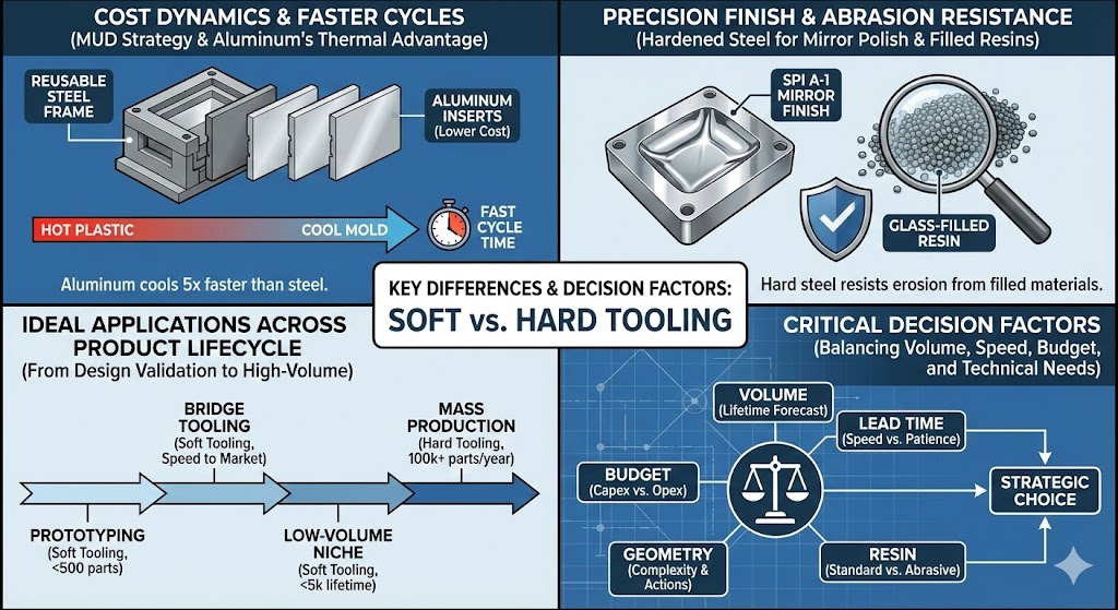Is é an difríocht is soiléire ná an costas tosaigh. Tá uirlisiú bog i bhfad níos saoire mar go bhfuil meaisíní alúmanam níos tapúla agus nach dteastaíonn aon chóireáil teasa iar-mheaisínithe. Is éard atá i gceist le huirlisiú crua ná cóimhiotail chruach daor, luasanna meaisínithe níos moille, agus próisis casta Meaisínithe Scaoilte Leictreach (EDM) go minic chun gnéithe a dhó go miotail chruaite.