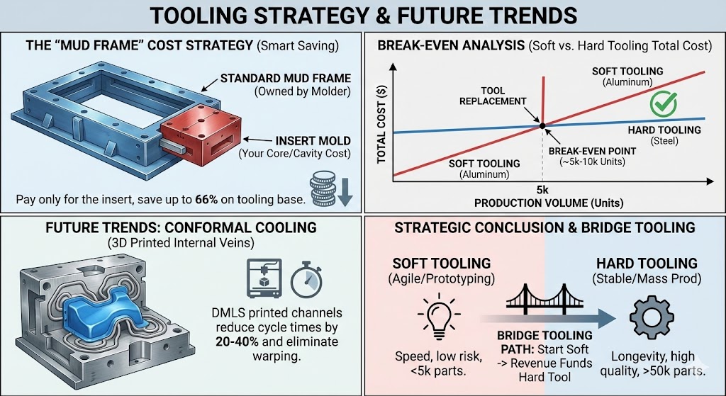 - Uirlisiú Bog Advantage: Tá seoltacht teirmeach i bhfad níos airde ag alúmanam ná cruach. Tarraingíonn sé teas as an plaisteach i bhfad níos tapúla, rud a ligeann don chuid soladú níos tapúla. Le haghaidh reáchtáil táirgeachta de 5,000 cuid, uaireanta is féidir leis an am timthriall níos tapúla d'uirlis alúmanam a chostas tosaigh níos airde a fhritháireamh i gcomparáid le huirlis cruach an-saor.